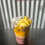 Acai banana blend, granola, mango puree, topped with fresh mangos and coconut flakes